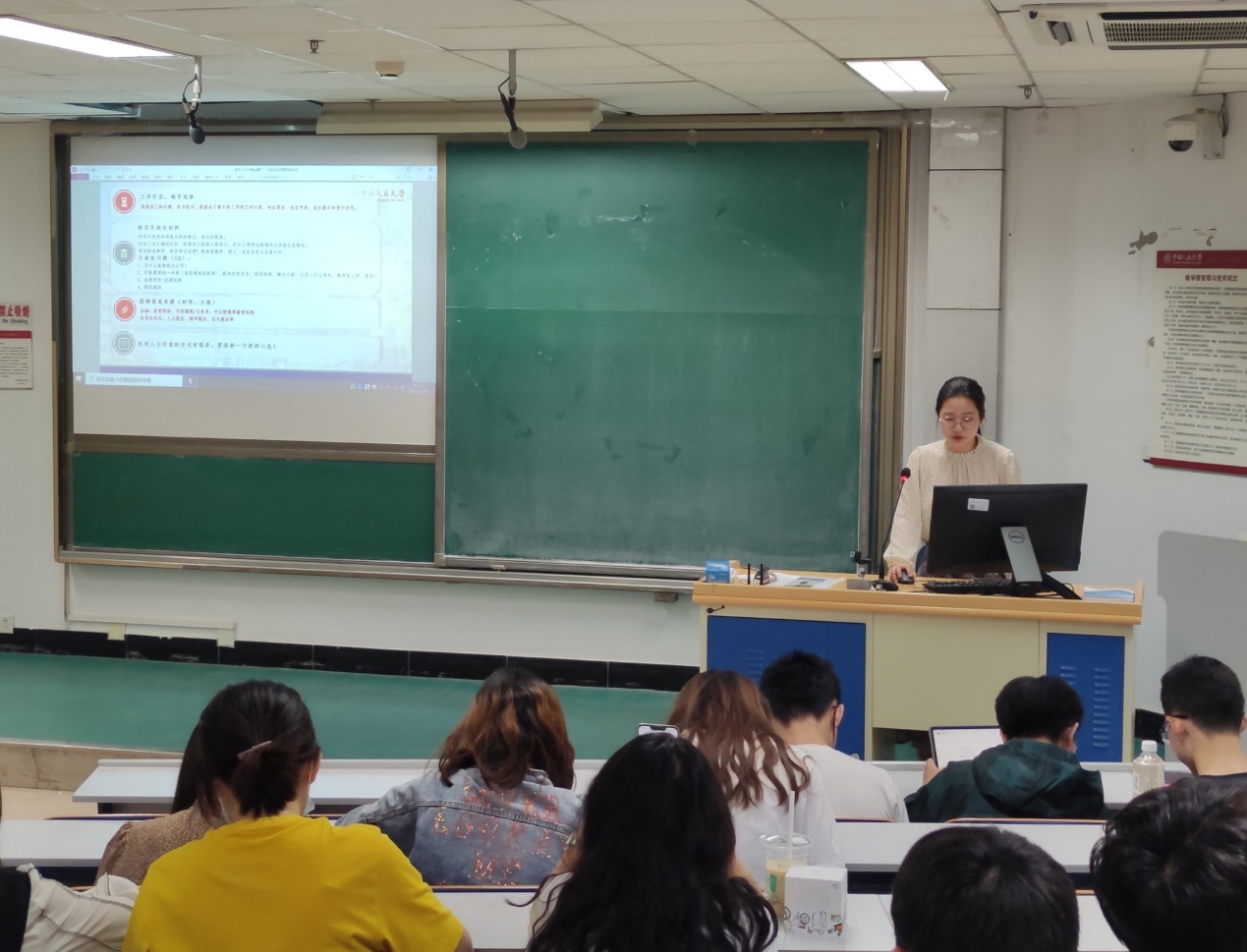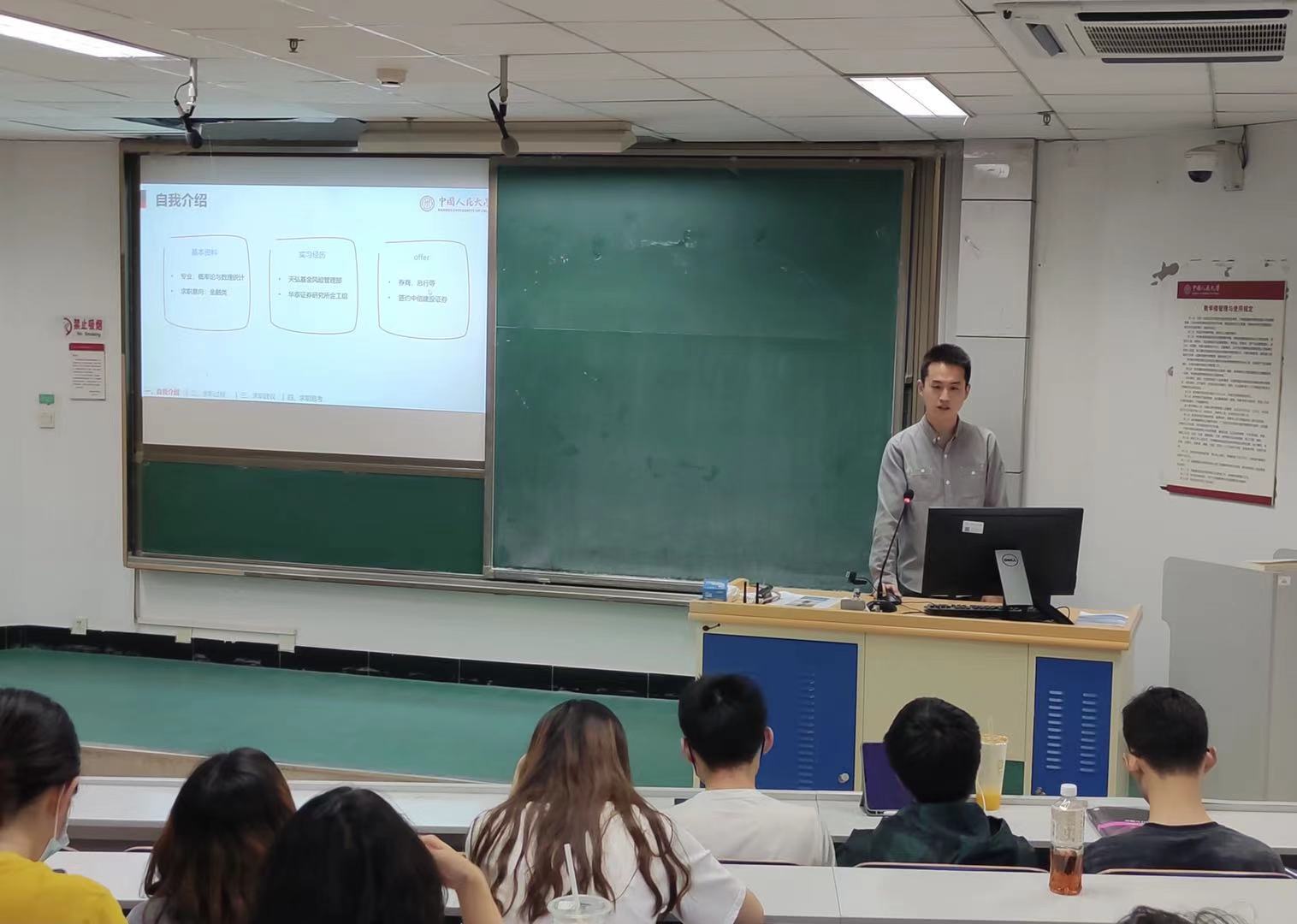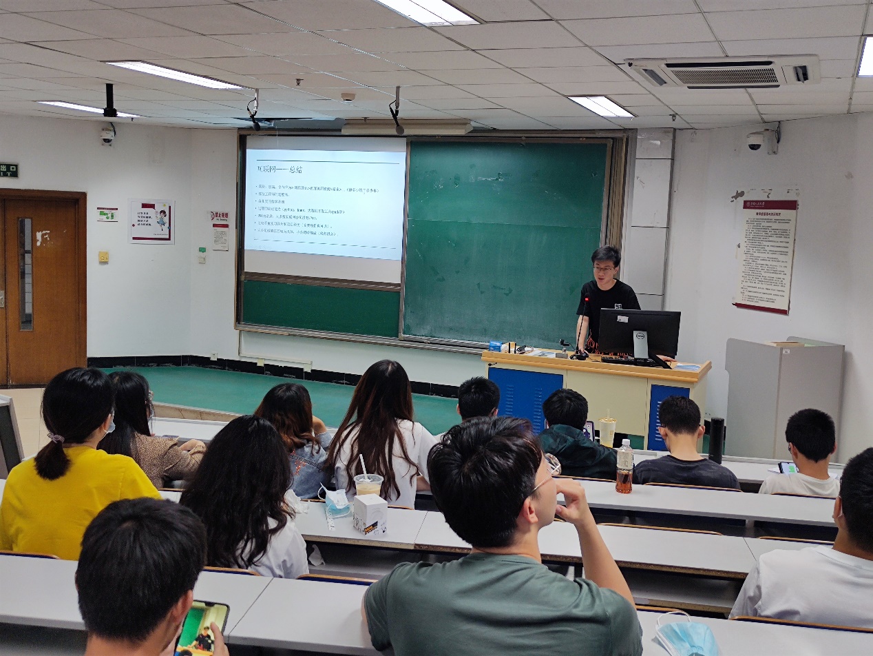 郭英栋同学为大家分享了互联网、银行的实习与求职经验。他首先为同学们分享了互联网实习及招聘的一些经验,先后介绍了互联网行业及其岗位划分,然后详细讲述了如何准备笔试及面试,不仅干货满满,也激起了同学们对互联网行业的浓厚兴趣。同时他谈到了银行的求职经历,生动有趣地分享了他在中国银行的实习经历及体验,比较了银行和互联网的工作内容。