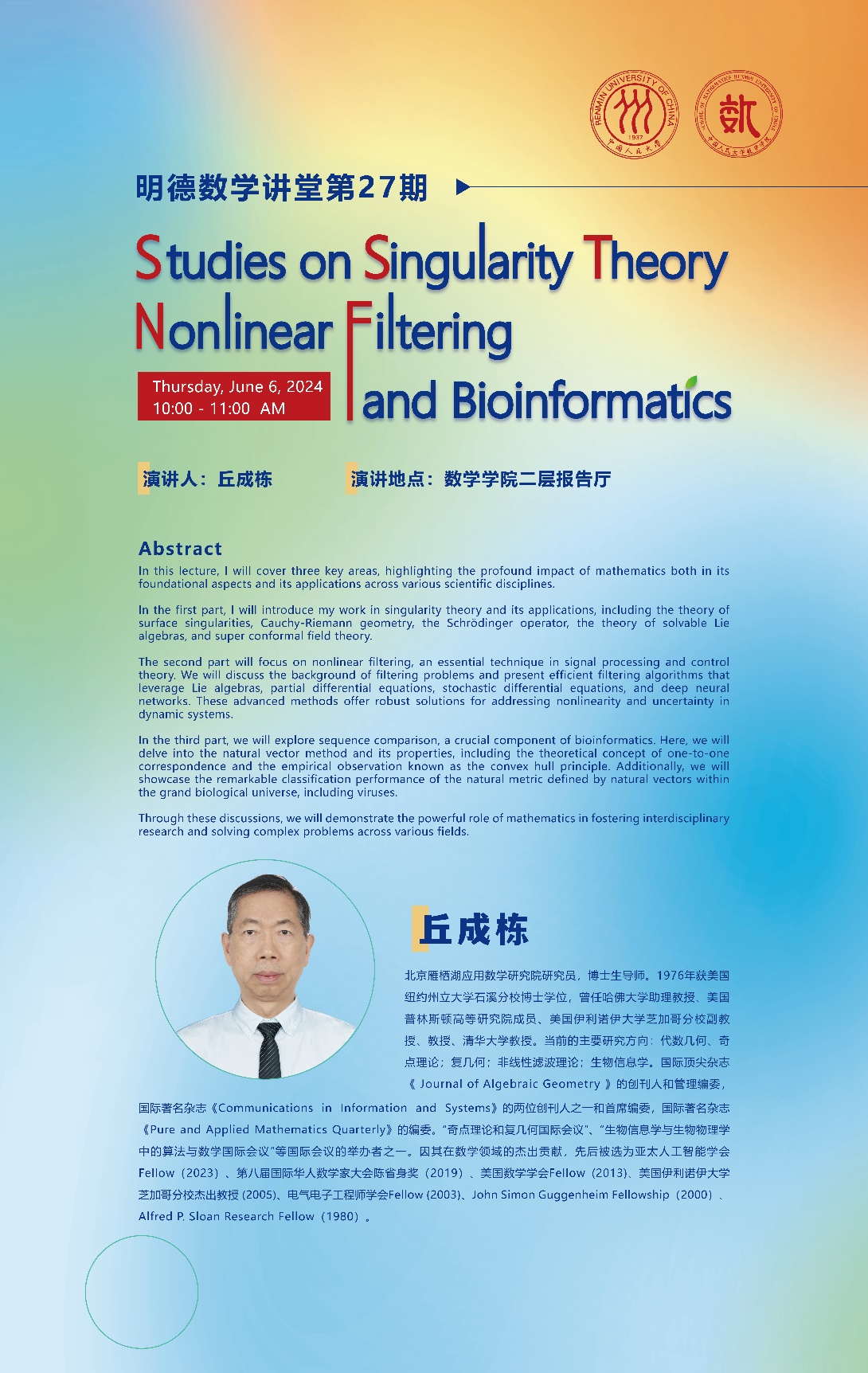 明德数学讲堂将于2024年6月6日上午10:00至11:00在ok1133快讯官方网站二层报告厅隆重举行!这一期我们邀请到了北京雁栖湖应用数学研究院研究员丘成栋,他将以“Studies on Singularity Theory Nonlinear Filtering and Bioinformatics”为主题开讲。这是一次难得的学习机会,欢迎大家与丘成栋教授进行面对面交流,ok1133快讯官方网站诚挚邀请大家前来聆听!