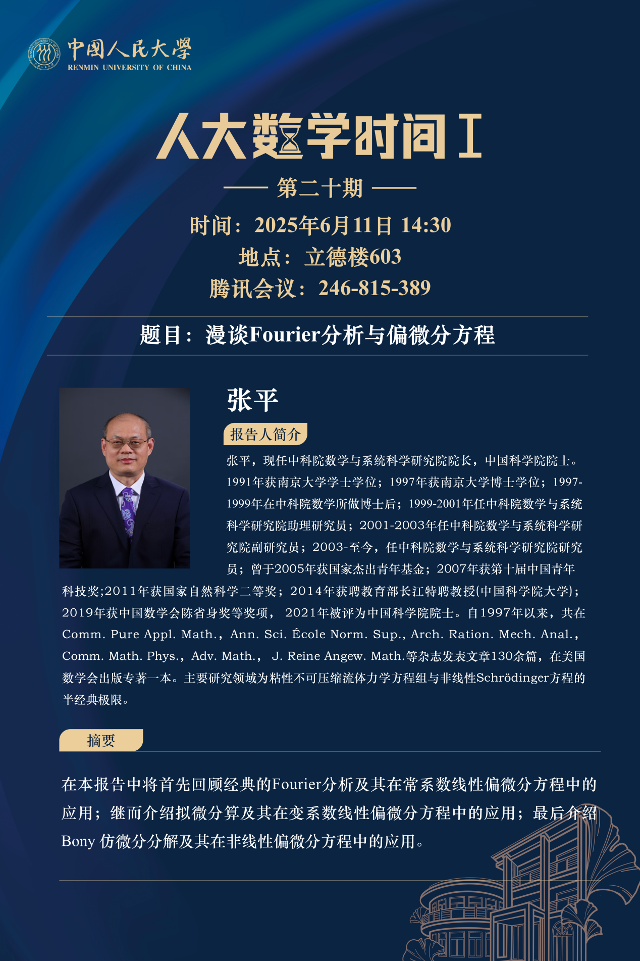 为促进学科交流融合、拓宽师生学术视野、释放科研创新活力,助力人大数学学科走向一流,诸侯快讯OK1133登录入口设立“人大数学时间”,以专题研讨、高端学术论坛为载体,搭建数学思想充分碰撞、优秀人才不断涌流、创造活力竞相迸发的舞台。“人大数学时间”将持之以恒,久久为功,立志通过交流与创新、提出重大问题,引领数学学科及相关领域的创新与发展,成为对我国数学发展有贡献意义的平台。以下为“人大数学时间I”第二十期信息: