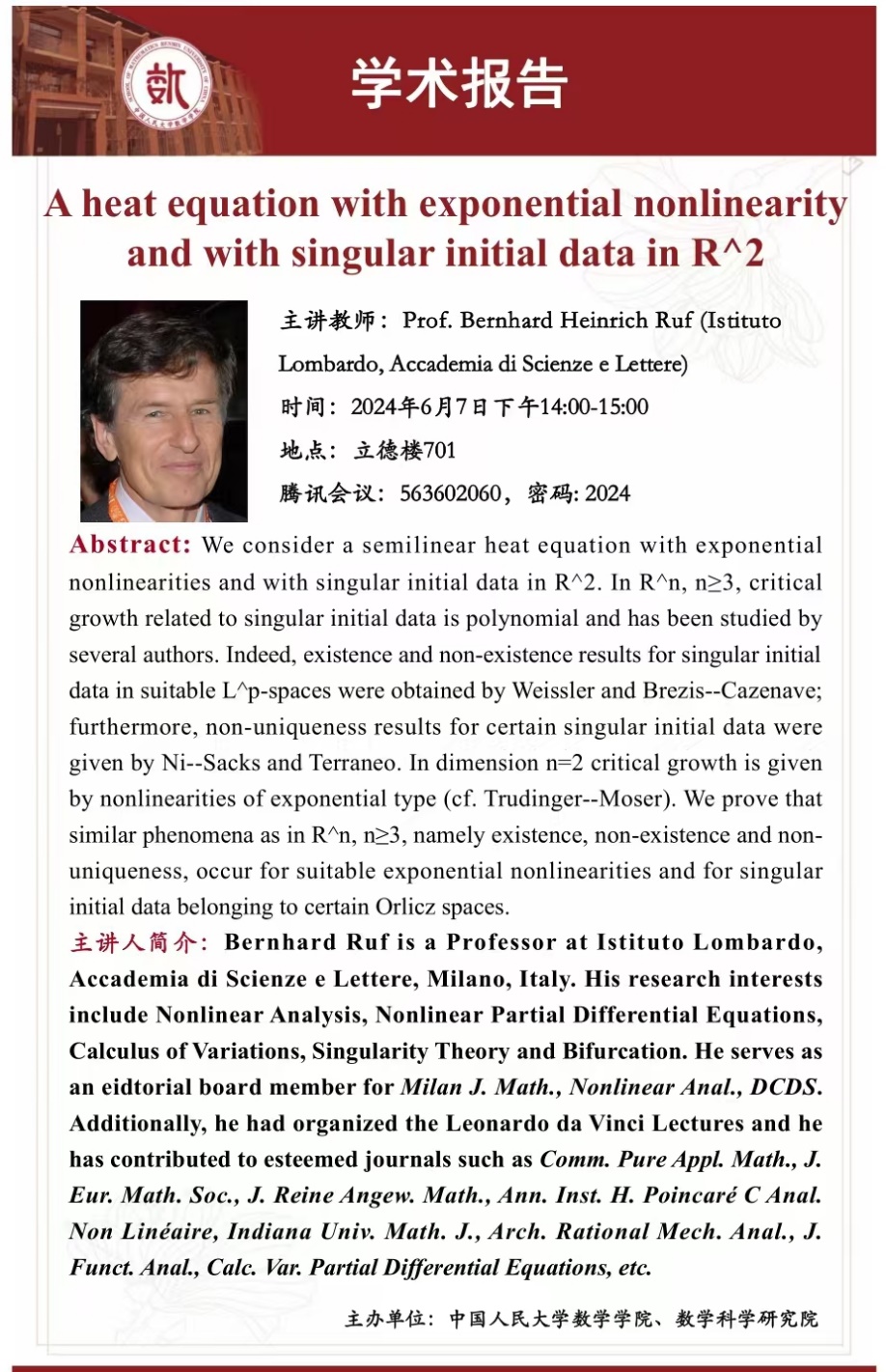 报告人简介: Bernhard Ruf is a Professor at Istituto Lombardo, Accademia di Scienze e Lettere, Milano, Italy. His research interests include Nonlinear Analysis, Nonlinear Partial Differential Equations, Calculus of Variations, Singularity Theory and Bifurcation. He serves as an eidtorial board member for Milan J. Math., Nonlinear Anal., DCDS. Additionally, he had organized the Leonardo da Vinci Lectures and he has contributed to esteemed journals such as Comm. Pure Appl. Math., J. Eur. Math. Soc., J. Reine Angew. Math., Ann. Inst. H. Poincaré C Anal. Non Linéaire, Indiana Univ. Math. J., Arch. Rational Mech. Anal., J. Funct. Anal., Calc. Var. Partial Differential Equations, etc.