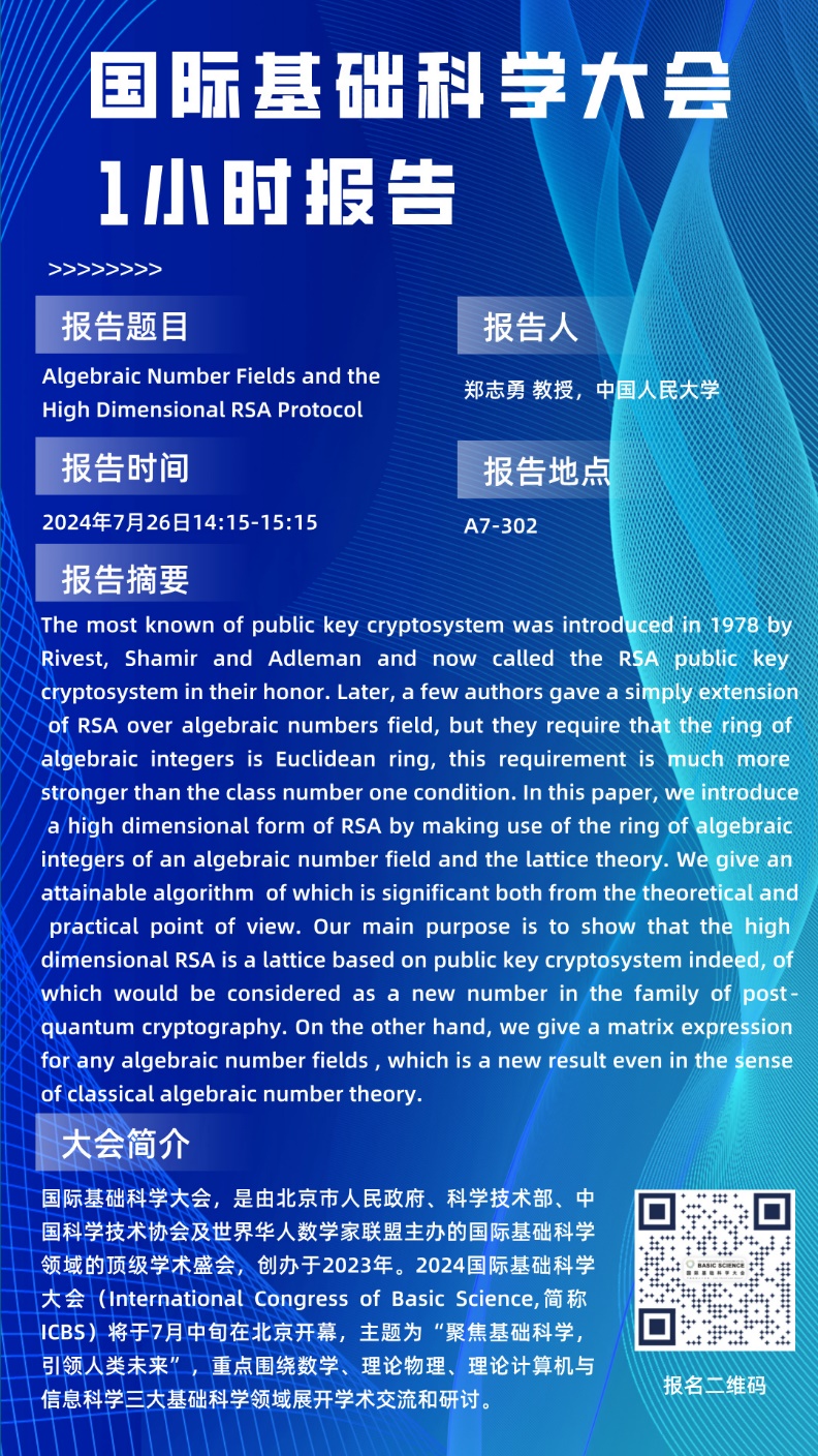 报告题目:Algebraic Number Fields and the High Dimensional RSA Protocol