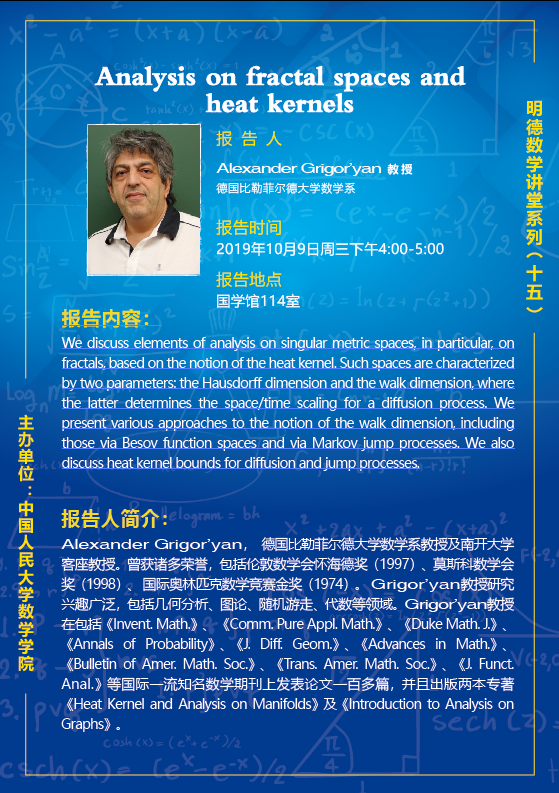 报告人:Alexander Grigor’yan教授,德国比勒菲尔德大学数学系