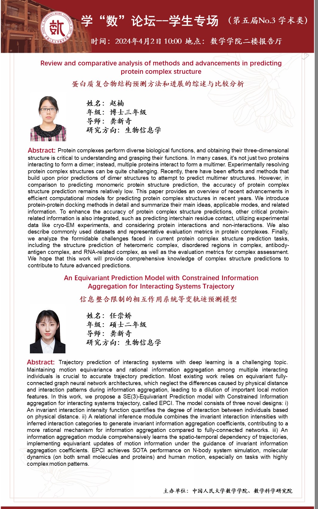 任崇娇同学师从我院龚新奇老师,主要研究方向是生物信息学。本次报告题目为《信息整合限制的相互作用系统等变轨迹预测模型》,