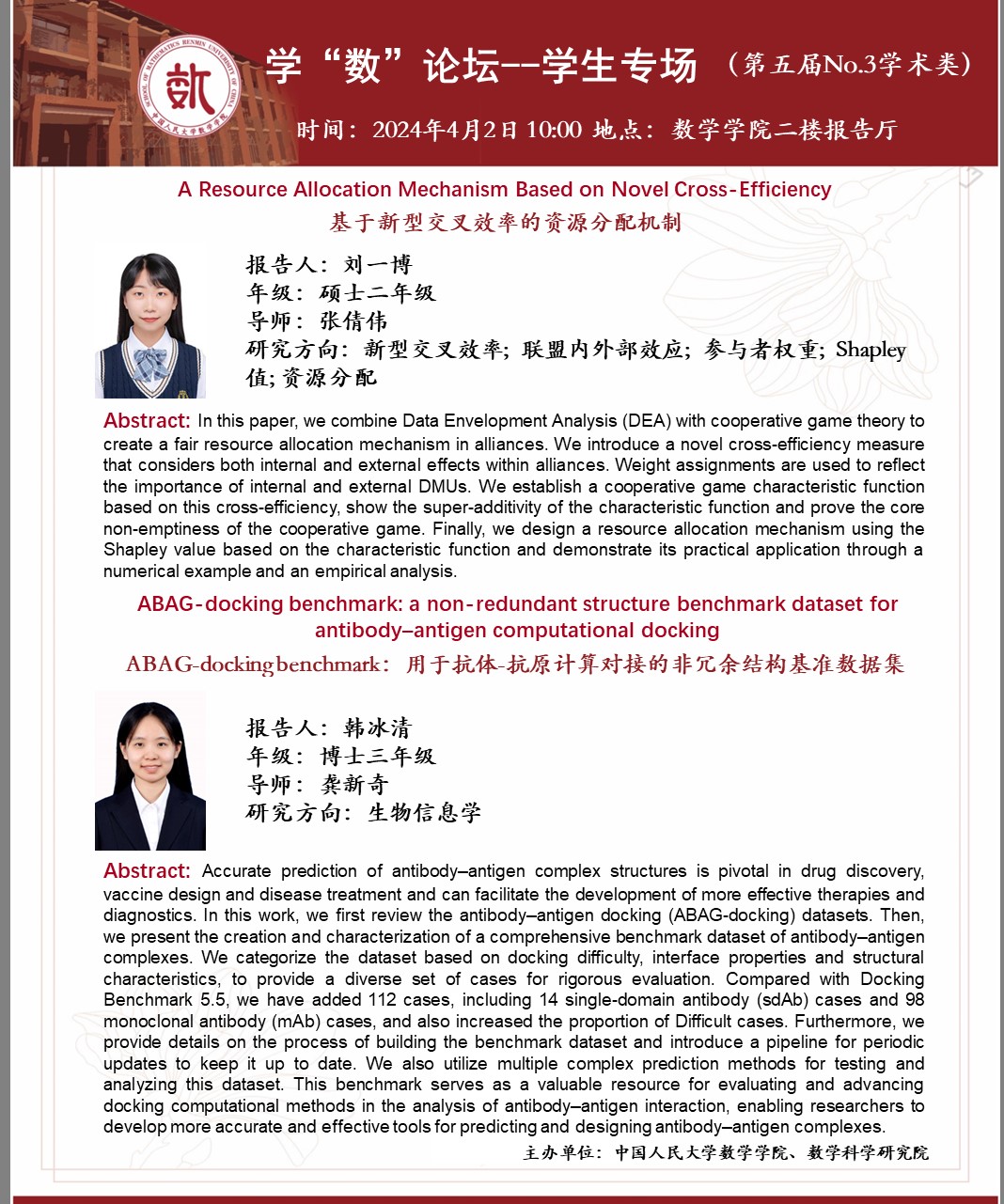 韩冰清同学师从我院龚新奇老师,主要研究方向是生物信息学。本次报告题目为《ABAG-docking benchmark:用于抗体-抗原计算对接的非冗余结构基准数据集