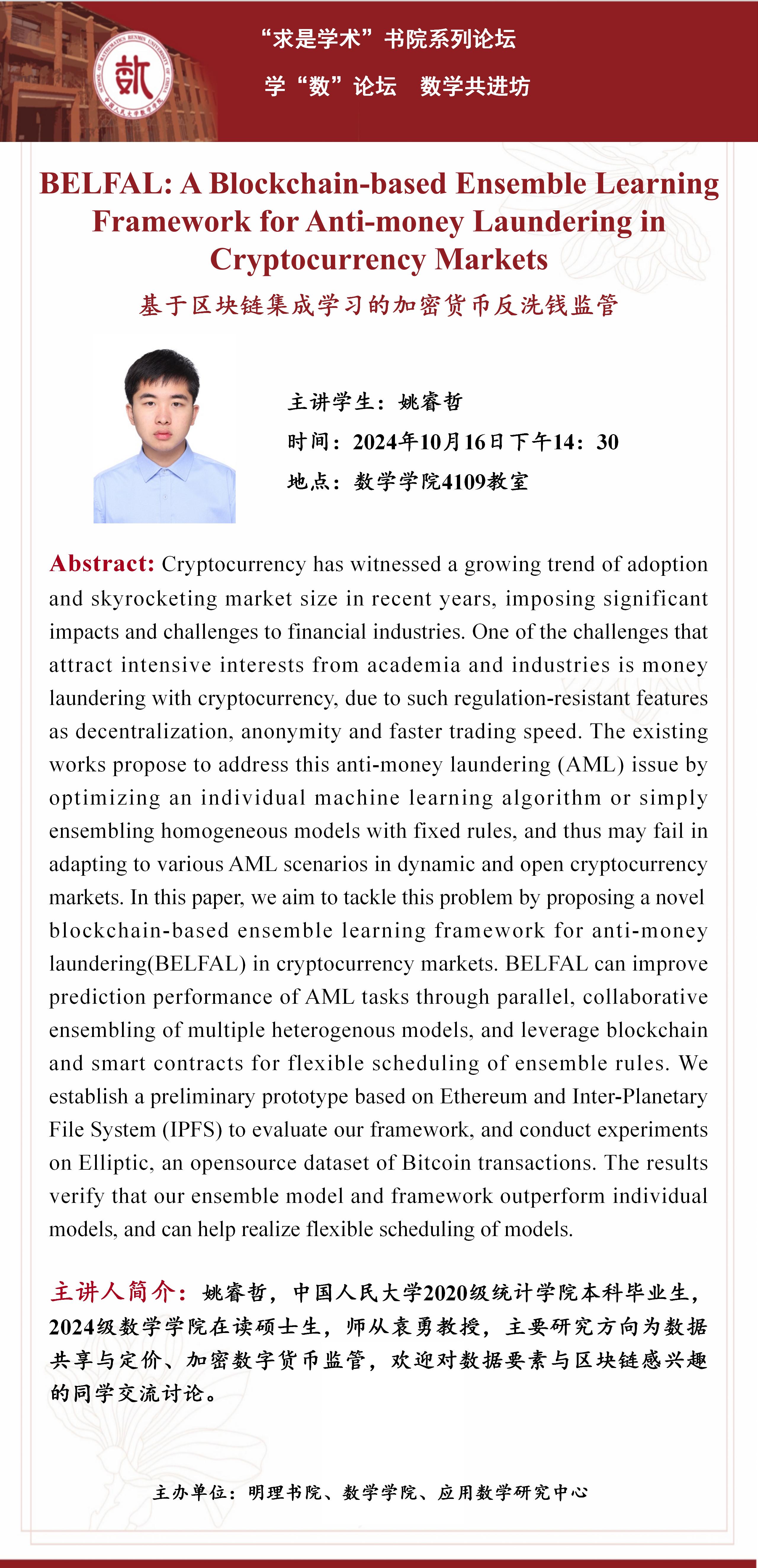 本场报告类型为学术类,将于2024年10月16日(星期三)下午14:30,在ok1133快讯官方网站4109教室进行,报告主讲人为硕士一年级姚睿哲同学,报告题目为《BELFAL: A Blockchain-based Ensemble Learning Framework for Anti-money Laundering in Cryptocurrency Markets》
