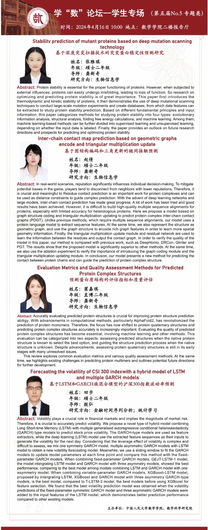 赵倩同学师从我院龚新奇老师,主要研究方向是生物信息学。本次报告题目为《基于图结构编码和三角更新的链间接触预测》,报告内容主要如下:
