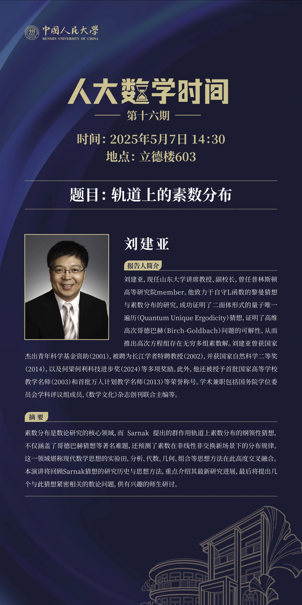 报告人简介:刘建亚,现任山东大学讲席教授、副校长,曾任普林斯顿高等研究院member。他致力于自守L函数的黎曼猜想与素数分布的研究,成功证明了二面体形式的量子唯一遍历(Quantum Unique Ergodicity)猜想,证明了高维高次哥德巴赫(Birch-Goldbach)问题的可解性,从而推出高次方程组存在无穷多组素数解。刘建亚曾获国家杰出青年科学基金资助(2001),被聘为长江学者特聘教授(2002),并获国家自然科学二等奖(2014),以及何梁何利科技进步奖(2024)等多项奖励。此外,他还被授予首批国家高等学校教学名师(2003)和首批万人计划教学名师(2013)等荣誉称号。学术兼职包括国务院学位委员会学科评议组成员,《数学文化》杂志创刊联合主编等。