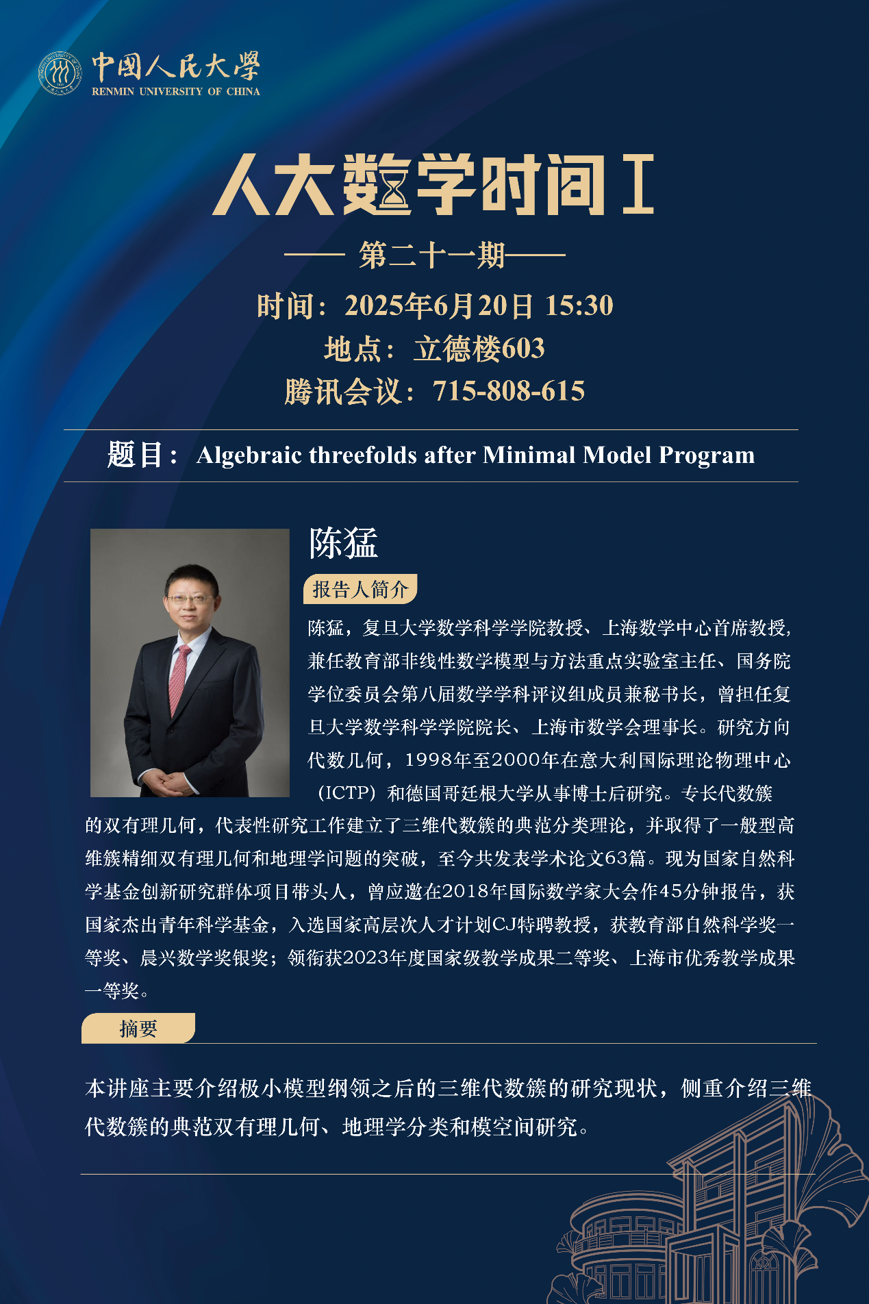 为促进学科交流融合、拓宽师生学术视野、释放科研创新活力,助力人大数学学科走向一流,诸侯快讯OK1133登录入口设立“人大数学时间”,以专题研讨、高端学术论坛为载体,搭建数学思想充分碰撞、优秀人才不断涌流、创造活力竞相迸发的舞台。“人大数学时间”将持之以恒,久久为功,立志通过交流与创新、提出重大问题,引领数学学科及相关领域的创新与发展,成为对我国数学发展有贡献意义的平台。以下为“人大数学时间I”第二十一期信息: