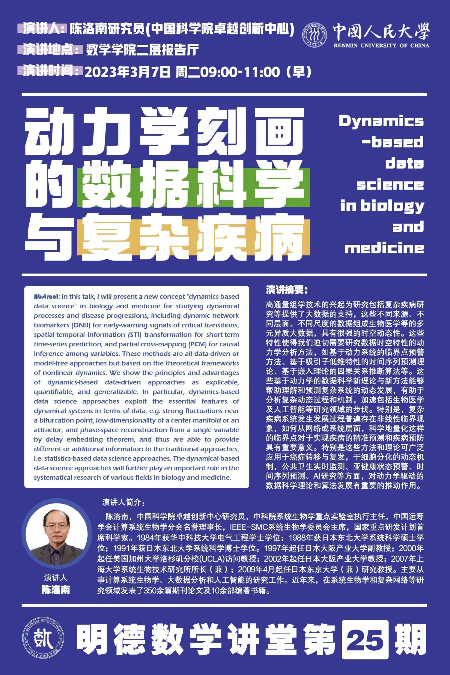 明德数学讲堂将于2023年3月7日上午9:00—11:00在ok1133快讯官方网站二层报告厅举行,本期邀请陈洛南研究员作“动力学刻画的数据科学与复杂疾病”的主题讲座,热烈欢迎所有感兴趣的老师和同学前来学习!