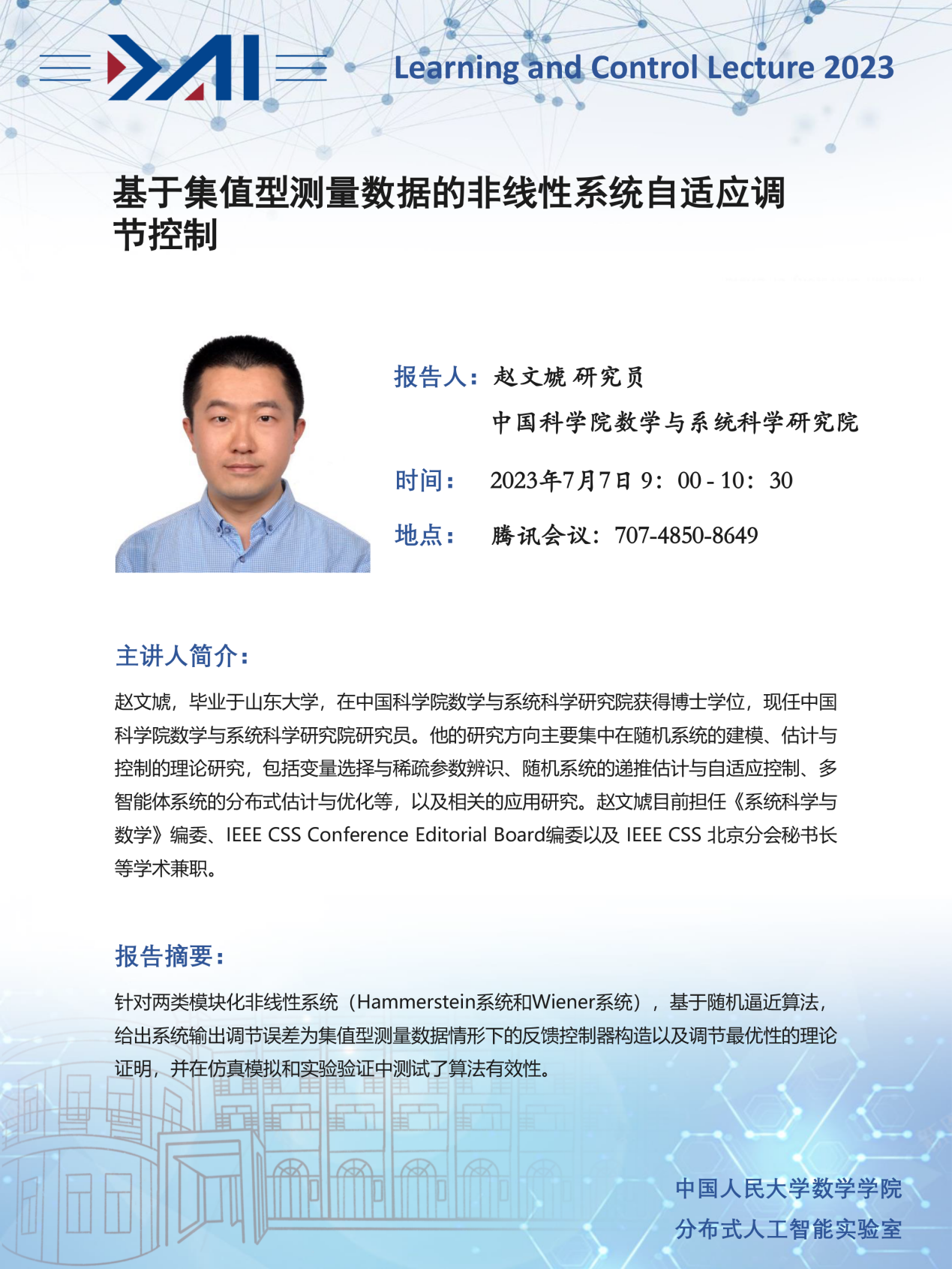 基于集值型测量数据的非线性系统自适应调节控制——赵文虓(中国科学院数学与系统科学研究院)