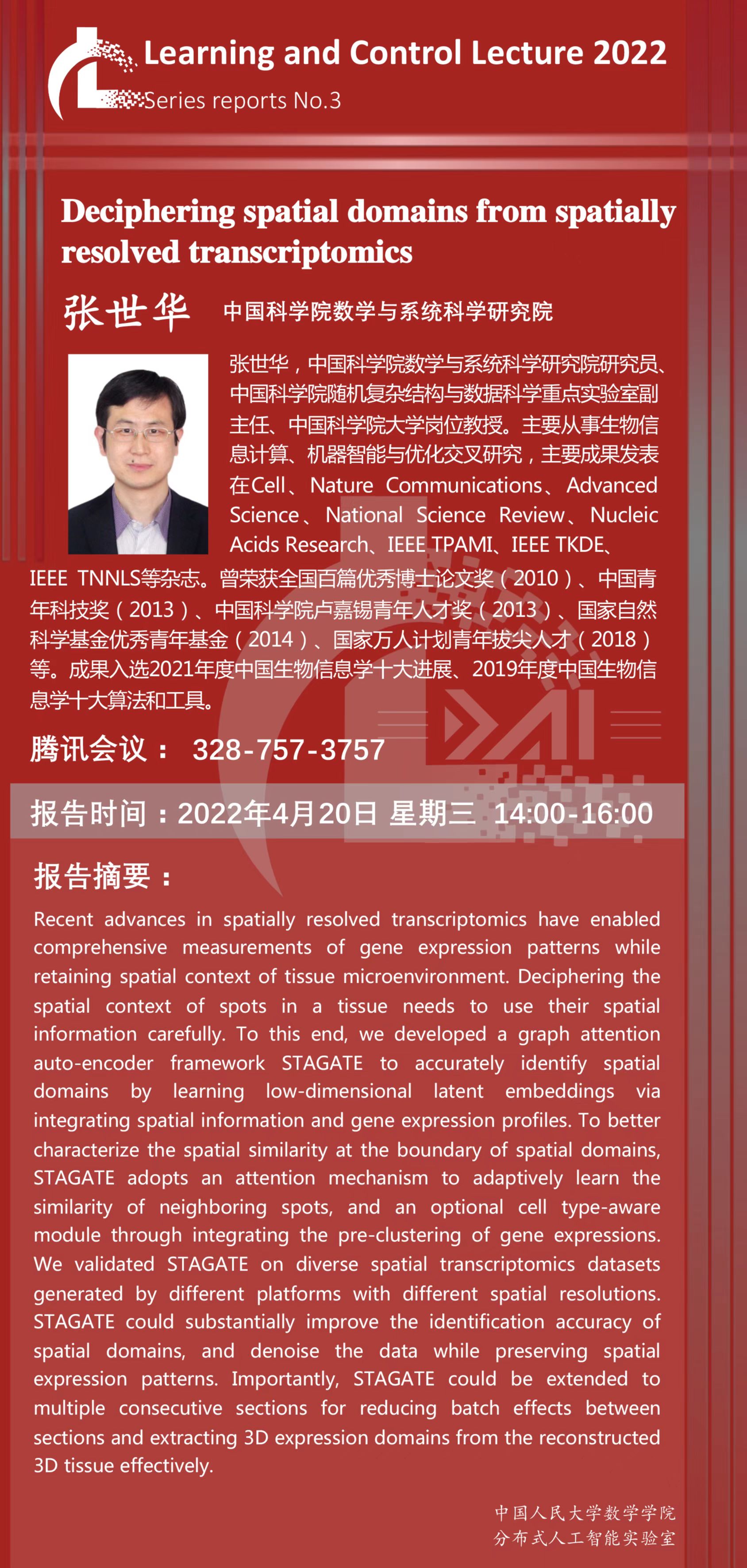报告人简介:张世华,中国科学院数学与系统科学研究院研究员、中国科学院随机复杂结构与数据科学重点实验室副主任、中国科学院大学岗位教授。主要从事生物信息计算、机器智能与优化交叉研究,主要成果发表在Cell、Nature Communications、Advanced Science、National Science Review、Nucleic Acids Research、IEEE TPAMI、IEEE TKDE、IEEE TNNLS等杂志。曾荣获全国百篇优秀博士论文奖(2010)、中国青年科技奖(2013)、中国科学院卢嘉锡青年人才奖(2013)、国家自然科学基金优秀青年基金(2014)、国家万人计划青年拔尖人才(2018)等。成果入选2021年度中国生物信息学十大进展、2019年度中国生物信息学十大算法和工具。