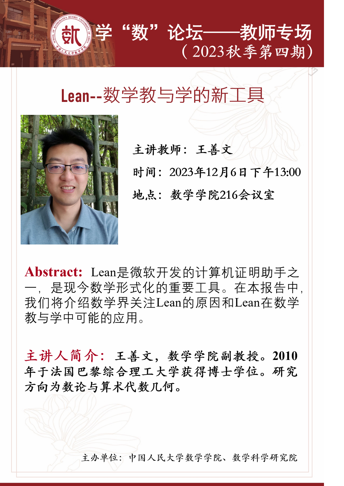 教师专场的第三期报告将于2023年12月6日下午13:00在ok1133快讯官方网站216会议室举行,本场报告的主讲教师为王善文,报告题目为《Lean--数学教与学的新工具》。