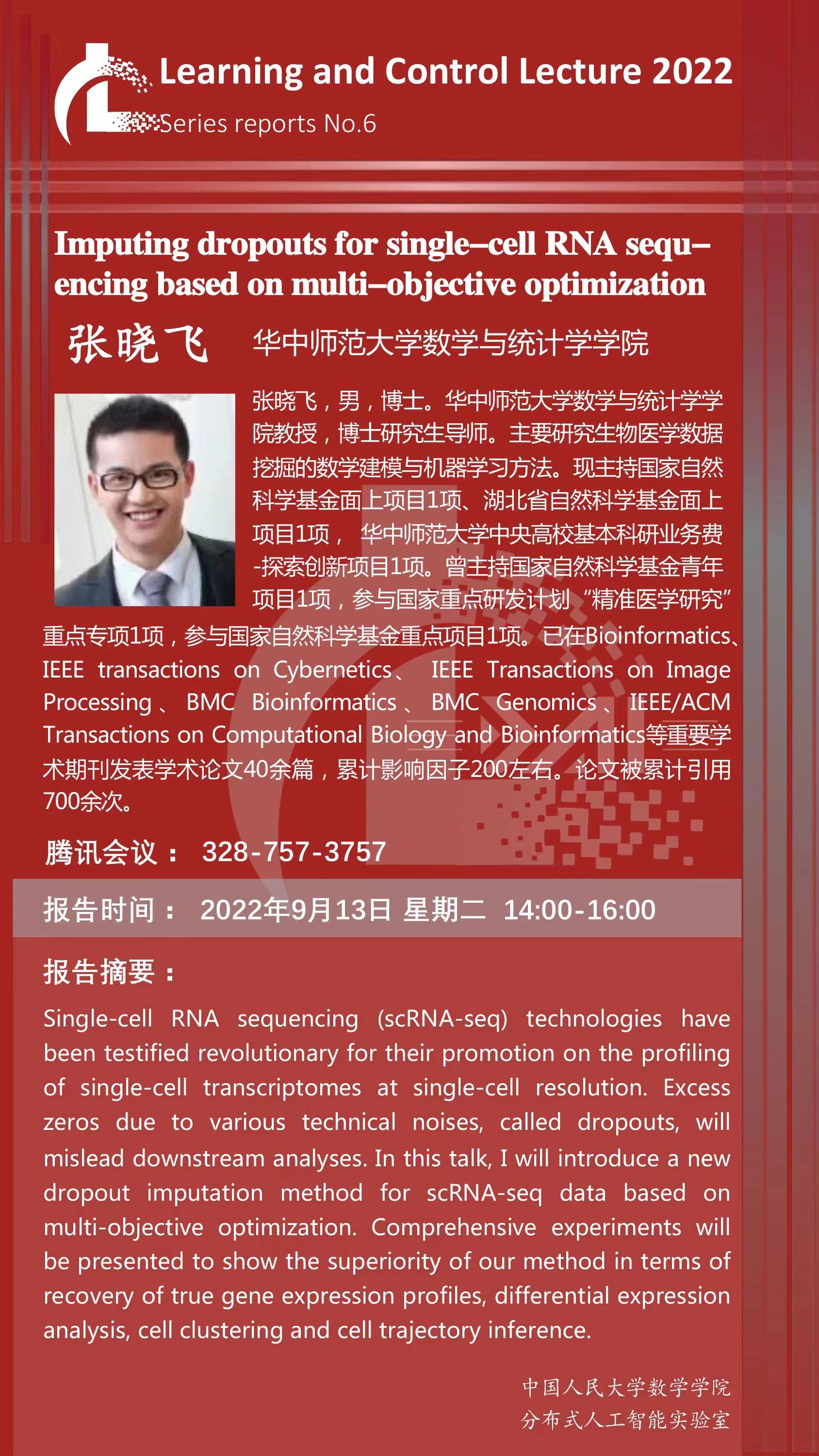 报告人简介:张晓飞,男,博士。华中师范大学数学与统计学学院教授,博士研究生导师。主要研究生物医学数据挖掘的数学建模与机器学习方法。现主持国家自然科学基金面上项目1项、湖北省自然科学基金面上项目1项, 华中师范大学中央高校基本科研业务费-探索创新项目1项。曾主持国家自然科学基金青年项目1项,参与国家重点研发计划“精准医学研究”重点专项1项,参与国家自然科学基金重点项目1项。已在Bioinformatics、 IEEE transactions on Cybernetics、 IEEE Transactions on Image Processing、BMC Bioinformatics、BMC Genomics、IEEE/ACM Transactions on Computational Biology and Bioinformatics等重要学术期刊发表学术论文40余篇,累计影响因子200左右。论文被累计引用700余次(谷歌学术)。