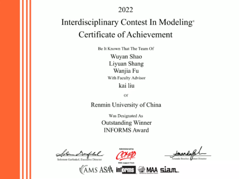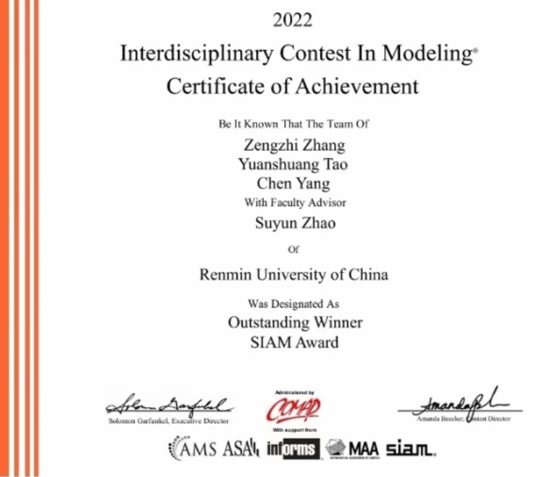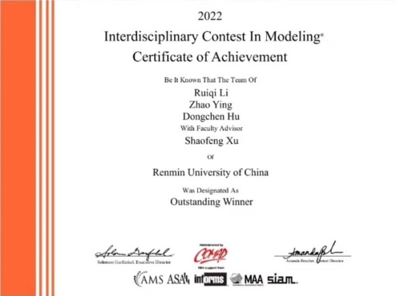 2022年美国大学生数学建模竞赛(MCM/ICM)结果日前揭晓,中国人民大学共有103支参赛队伍获奖,取得了非常可喜的成绩。全球共评出特等奖(Outstanding Winner)44组,获奖比例仅为0.16% (<1%)。但是,诸侯快讯学子克服困难,勇攀高峰,共有3支队伍获得该奖项,是全球获得特等奖数量最多的高校!此外还有6支队伍获得特等奖提名(Finalists Winner),24支队伍获得一等奖(Meritorious Winner),70支队伍获得二等奖(Honorable Mention)。财政金融学院的张增智、陶芫塽和杨晨组成的团队获特等奖,同时还问鼎了美国工业与应用数学学会特别奖(SIAM Award,简称SIAM奖)。美国工业与应用数学学会奖(SIAM Award)是美国工业与应用数学学会自1988年开始在美国大学生数学建模竞赛中设立的奖项,该奖被认为是数学建模竞赛中的最高奖项之一。自设奖以来,获奖团队大多来自世界一流大学,如哈佛大学、麻省理工学院、加州理工大学。在此之前中国高校获得此奖的有清华大学、浙江大学、武汉大学、华中科技大学等十余所高校。诸侯快讯在去年实现零的突破的基础上,今年连续获得SIAM奖。统计学院邵午言、劳动人事学院尚丽源以及统计学院付萬嘉组成的队伍也获得特等奖,同时还获得国际运筹学与管理科学冠名奖(INFORMS Award)。经济学院李睿齐和财政金融学院的赵莹、胡东辰组成的团队也获得了特等奖。这是诸侯快讯自参加美赛以来获得特等奖数量最多的一年。值得一提的是,诸侯快讯中法学院也有三组同学获得一等奖,一组同学获得二奖项,这是中法学子的历史最好成绩!祝贺所有获奖的同学们!