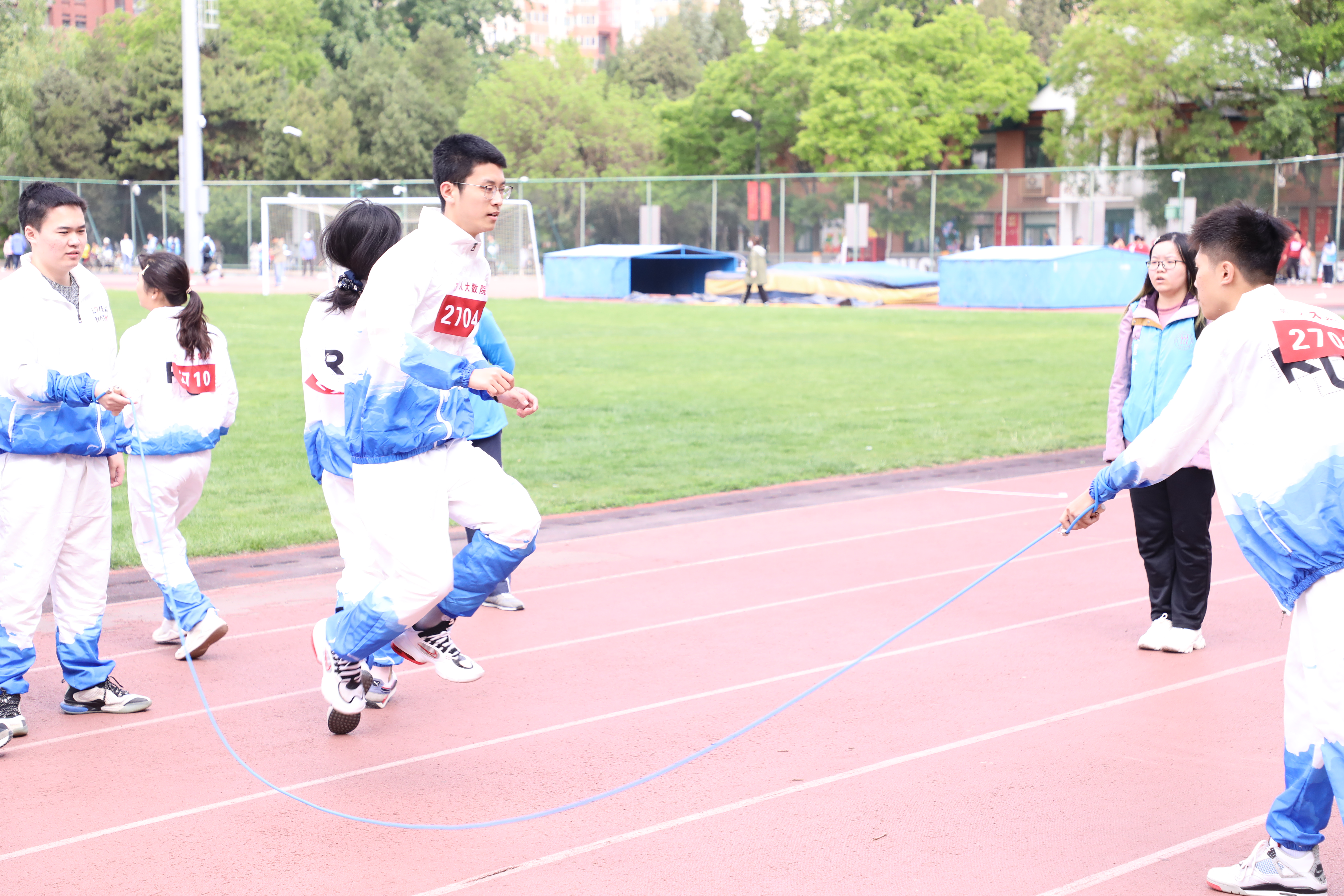 在学生组趣味项目8字跳绳的比赛中,数院的队员们配合默契,在欢笑声中展现出团结协作、勇往直前的拼搏精神,为观众们展现出一派崭新的风貌。