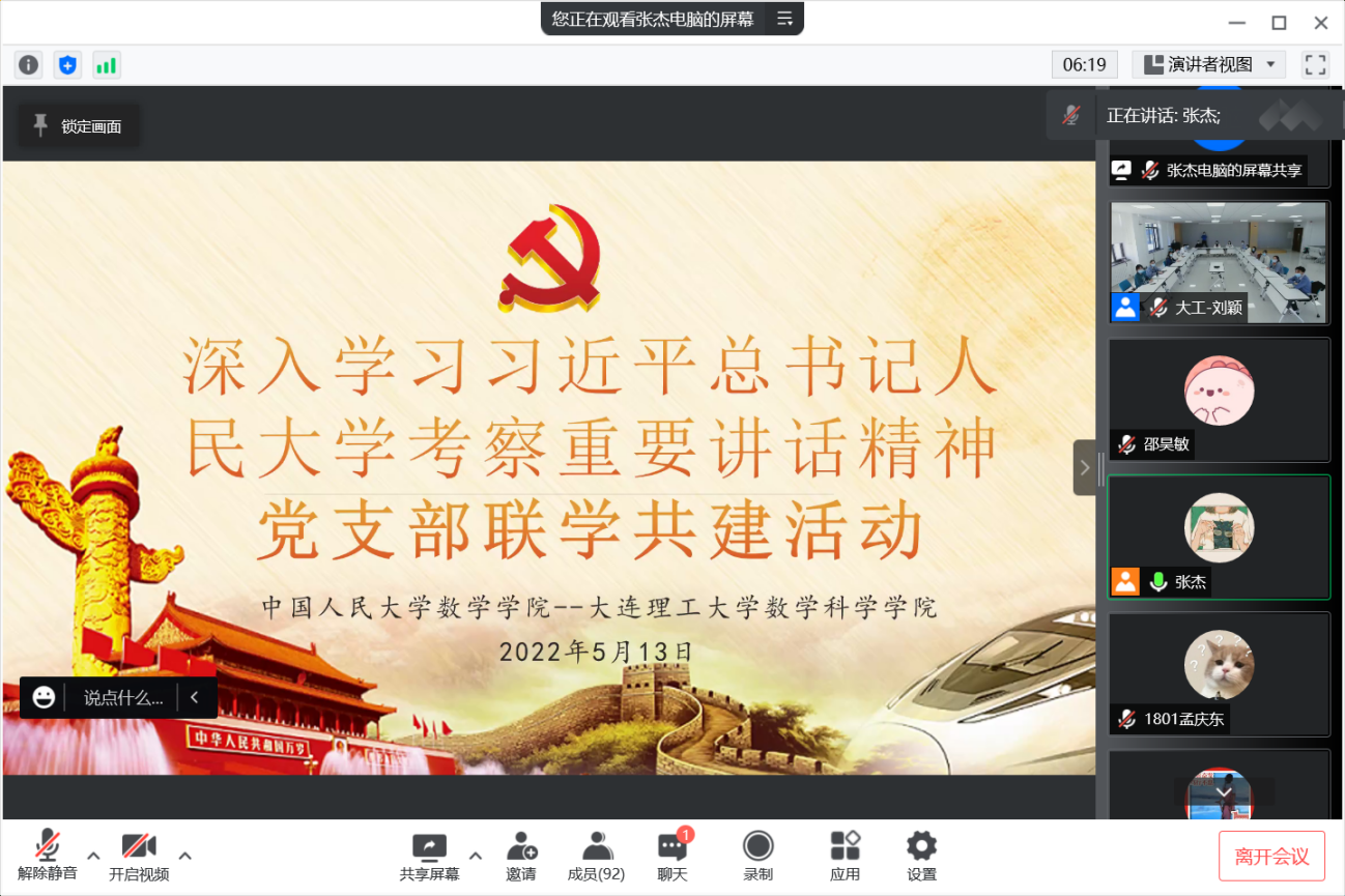 会上,人大学生党员张经纬、封嘉誉、伊力扎提·安尼瓦尔,大连理工大学学生党员付一宸、万禹彤、李宁依次分享学习心得。
