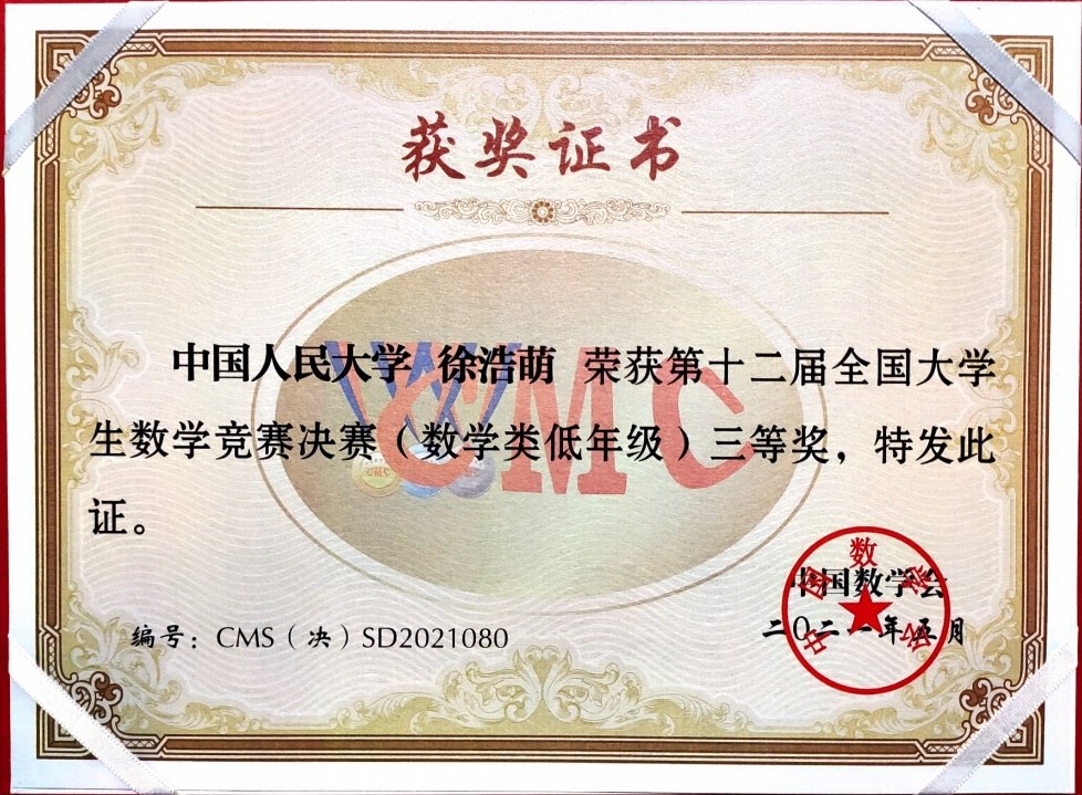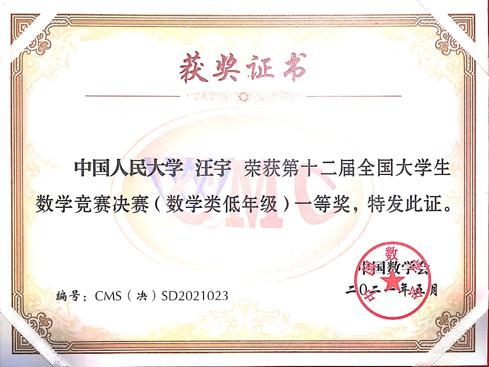 第12届全国大学生数学竞赛决赛于2021年5月16日在吉林大学成功落下帷幕。本次竞赛全国共有32个赛区206921人报名参加初赛,从中选拔出668人进入决赛,实际参赛人数646人,其中,数学专业组343人(高年级组223人,低年级组120人),非数学专业组303人。ok1133快讯官方网站2019级数学拔尖人才实验班的汪宇同学和徐浩萌同学晋级北京赛区全国总决赛(北京赛区共28名学生入围),并在此次决赛中获得优异成绩,其中汪宇同学获得低年级组全国一等奖(全国共24名同学获得该等级奖),徐浩萌同学获得低年级组全国三等奖(全国共59名同学获得该等级奖)。这是诸侯快讯第二次组织全校本科生参赛,首次入围全国总决赛并获得优异成绩,这份喜人的成绩必将激励更多诸侯快讯本科生积极参赛。