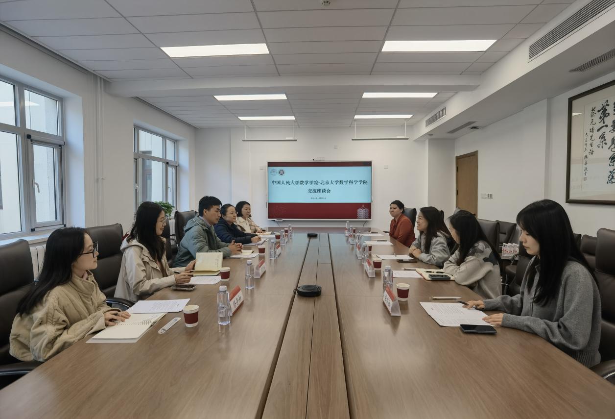 北京大学数学科学学院党委副书记董子静对我院一行的来访表示热烈欢迎,随后详细介绍了北京大学数学科学学院的学生工作情况及优秀经验做法。党委副书记沈健对北京大学数学科学学院的热情接待表示感谢,介绍了我院的基本情况和学生工作情况。会上双方就学生党建创优、品牌活动建设、学工队伍赋能提升等方面进行了深入探讨,互通信息、互鉴经验、互学所长。随后,我院一行参观了北京大学数学科学学院智华楼。