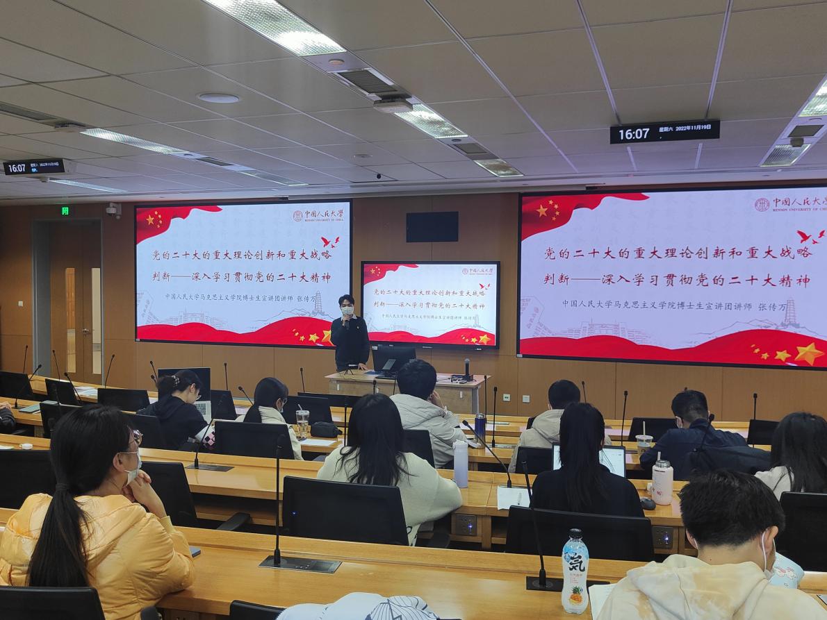 作为人大学子,我们要深入学习宣传贯彻党的二十大精神,在党的二十大精神的指引下,不忘初心、牢记使命,谦虚谨慎、艰苦奋斗,建功新时代、奋进新征程,争做复兴栋梁、强国先锋,为全面建设社会主义现代化国家、全面推进中华民族伟大复兴贡献青春力量。