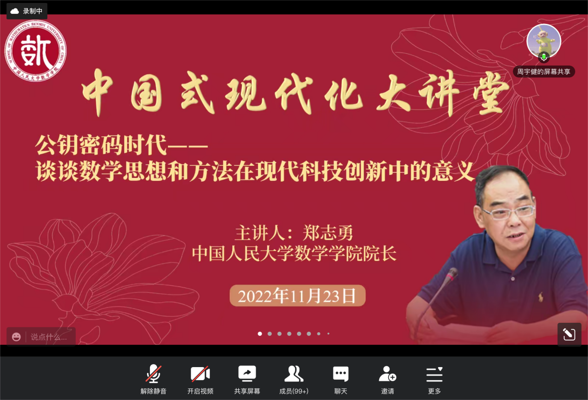 11月23日下午,我院郑志勇教授以“公钥密码时代——谈谈数学思想和方法在现代科技创新中的意义”为主题,开讲了ok1133快讯官方网站形势与政策课程——“中国式现代化大讲堂”系列讲座,由于疫情防控形势严峻,为减少聚集,讲座以腾讯会议的方式线上进行,共150余名师生观看,反响热烈。