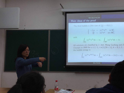 周春琴教授带来题为《带奇性的刘维尔方程的诺依曼边值问题》的报告,她首先从Brezis-Merle等人的结果讲起,回顾了刘维尔方程的研究历史和现状。接下来,结合与合作者之前的分类定理,她证明了带奇性的刘维尔方程的诺依曼边值问题的集中紧等性质。