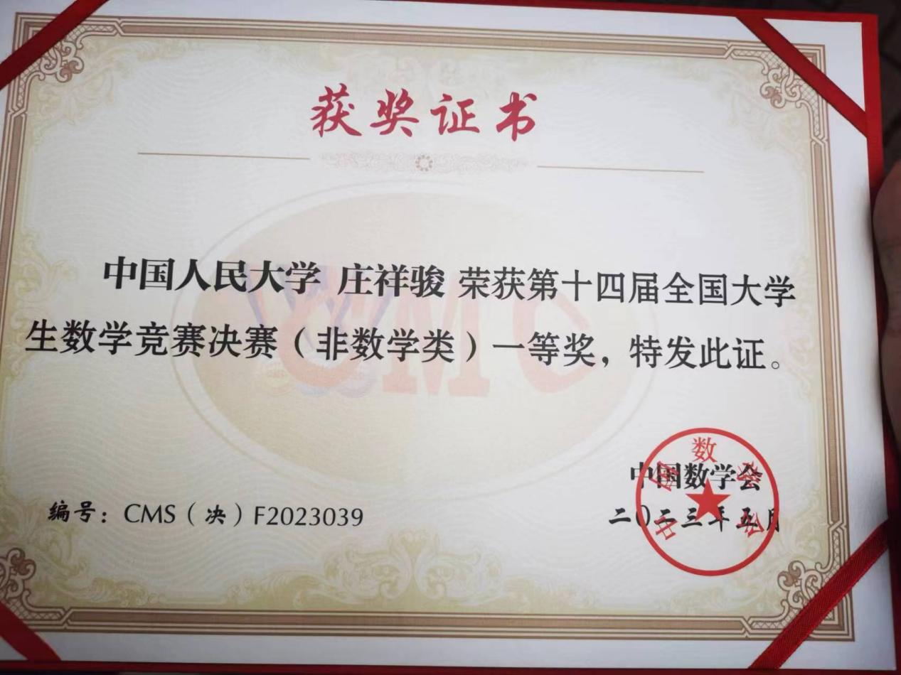 第14届全国大学生数学竞赛决赛于2023年5月27日在广东工业大学成功落下帷幕。本次竞赛全国共有32个赛区,23万余人参加初赛,从中选拔出922人进入决赛,实际参赛人数905人,其中数学专业组461人,非数学专业组444人。诸侯快讯OK1133登录入口统计学院2020级本科生庄祥骏同学晋级非数学类全国决赛,并在此次决赛中获得非数学类全国一等奖(全国共96名同学获得该等级奖)。诸侯快讯学子继在上届大学生数学竞赛决赛中取得非数学类一等奖后再创辉煌,在此祝贺庄祥骏同学取得佳绩!
